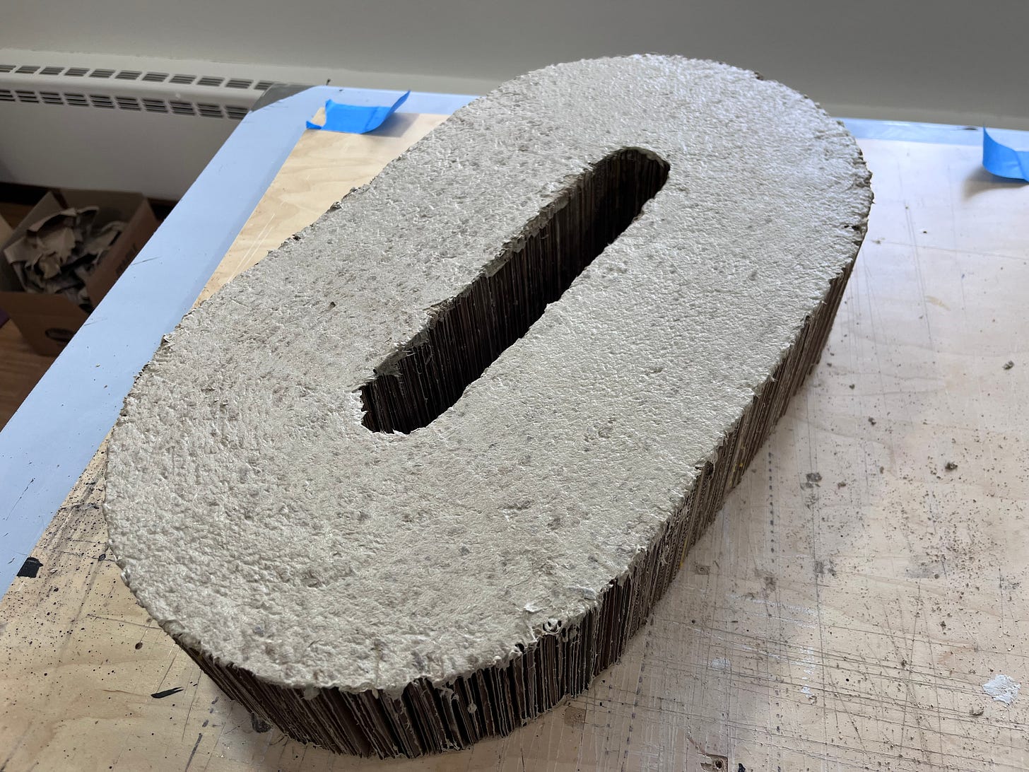 The stadium piece currently in progress is roughly 14 by 22 inches and 4 inches deep. The circle will be about 24 inches in diameter with a 6-inch center void. Both are intended for wall mounting, but their depth means they’ll cast shadows and occupy space in ways the earlier work didn’t.