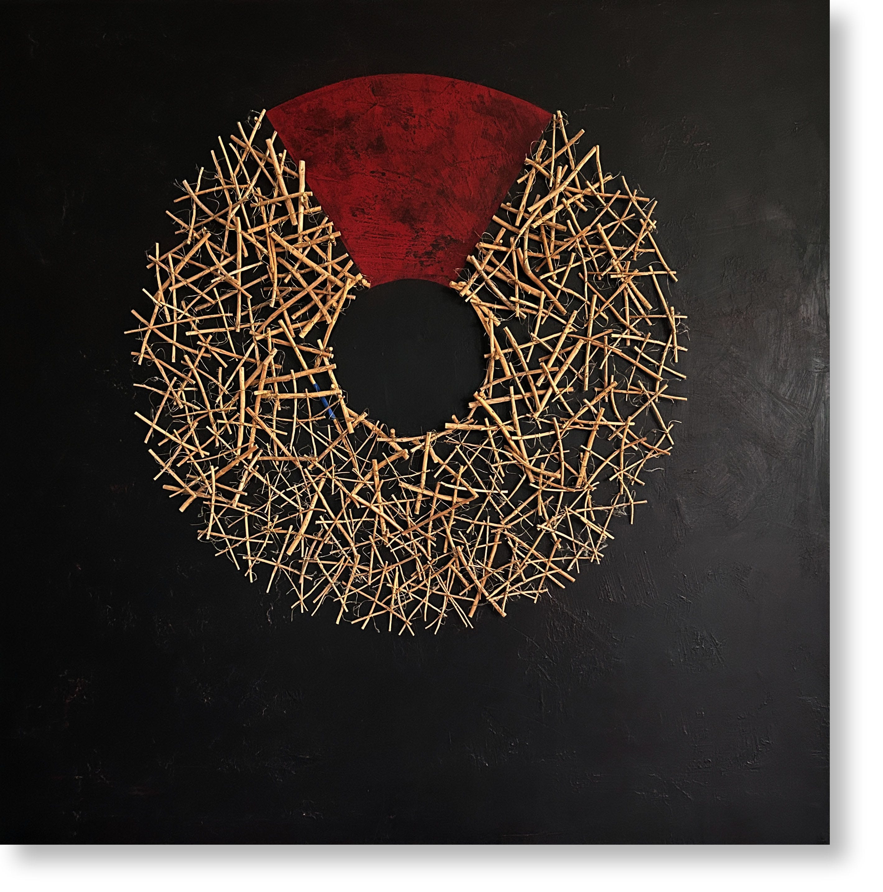 And here’s one from 2005. A circle made from ‘naked’ redwood sticks, with a red wedge breaking into the form. I’d find them on my walks after a wet storm on Kings Mountain. The streets would be littered with them. If you look closely, you’ll find a single stick with a blue center—a quiet interruption that rewards closer inspection.