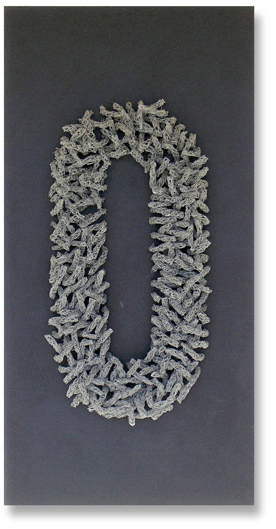 Here’s a piece from 2007. Chicken wire, cut into strips, rolled into small tubes, and arranged into that stadium shape against a dark ground.